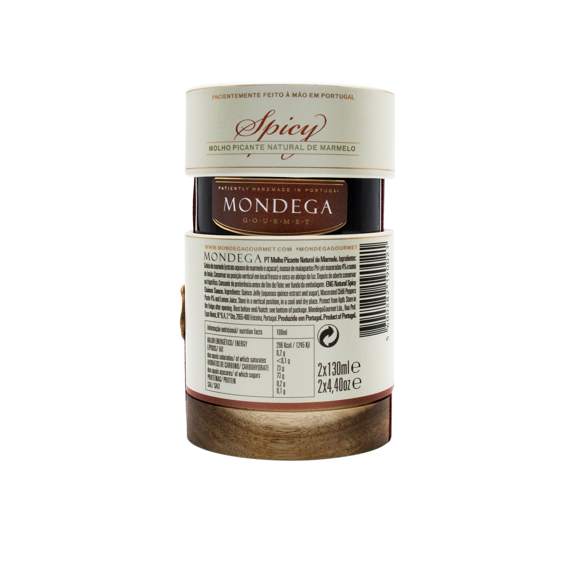 Ce produit, de production extrêmement limitée, est patiemment fabriqué à la main et son packaging est impeccable et innovant. Fabriquée à partir d'un extrait aqueux de coings, de sucre, de piments macérés et de jus de citron, cette sauce épicée est l'un des derniers produits de Mondega. Ni sucré ni extrêmement épicé, il accompagnera parfaitement une viande grillée ou cuite au four, une salade ou même un dessert.