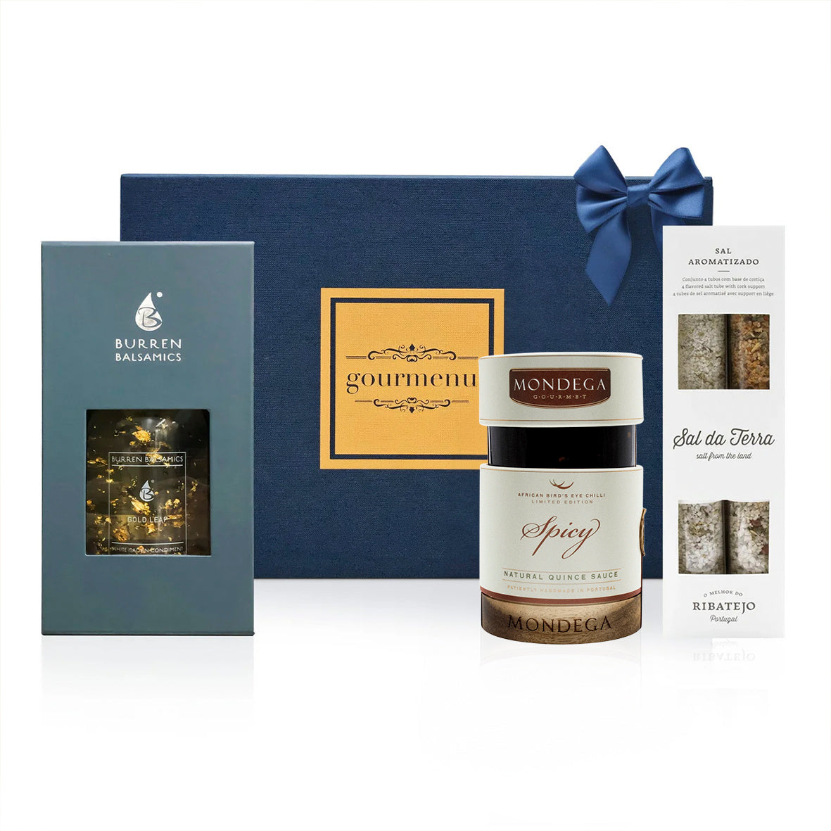 Uma combinação de vinagre balsâmico com folhas de ouro, um conjunto de 4 tubos de flor de sal aromatizada com base de cortiça natural e um molho picante artesanal de marmelo, com um sabor complexo e robusto, onde a intensidade da fruta se harmoniza com o toque ardente da malagueta.